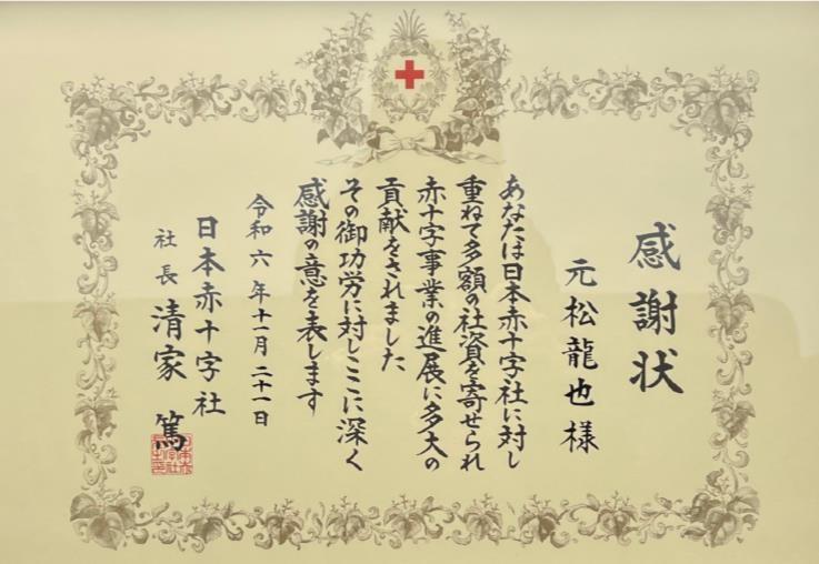 荣任为日本红十字会名誉总裁的皇后美智子为迎接日本红十字会创立140周年,特于2017年11月20日在大阪的Sheraton-Miyako 酒店举办了周年大会。本集团会长-元松龍也先生因长期对社会活动之贡献,以及长年的捐款赞助而受到日本红十字会的肯定与评价。